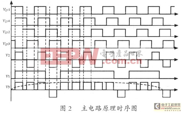 前级的移相变换器采用目前应用最广泛的软开关电路——移相全桥型零电压电路(ZVS),其原理是利用变压器漏感LIK和功率管输出电容Gi谐振,漏感储能在向Gi释放过程中,使Ci电压逐步下降到零,体二极管Di开通,创造了开关管的ZVS条件。为了改变占空比D,实现调压控制,采用了移相技术。每个桥臂的两个开关管成互补导通,两个桥臂的导通角相差一个相位,即移相角,通过调节移相角的大小来调节输出电压。S1和S2分别超前于S3和S4一个相位,称S1和S2组成的桥臂为超前桥臂,S3和S4组成的桥臂则为滞后桥臂。通过改变开关管控制策略,使其中一个开关管先关断,一次绕组与谐振电容配合,并产生可控的dr/df。漏电感和功率MOSFET的输出电容构成了谐振网络,同时实现了ZVS控制。系统的脉冲工作时序如图2所示,经过全桥移相变换器的高频逆变,输出100kHz相邻脉冲互为反极性的SPWPM(正弦脉宽脉位调制)波,该波形含有SPWM波的全部信息,但不含400Hz调制波的基波成分,因而可以利用高频变压器进行耦合传输。后级的交交周波变换器采用脉冲密度调制方式,将高频交流SPWPM波调制常规的SPWM波,其原理是输出的电压波形是由输入的高频离散半周期脉冲数目或密度“拼凑”合成。将得到的·400Hz SPWM波通过LC滤波,则输出光滑的115V/400Hz的正弦波。