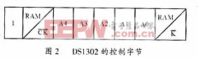 DS1302的控制字如图2所示。控制字节的最高有效位(位7)必须是逻辑1,如果它为0,则不能把数据写入DS1302中,位6如果为0,则表示存取日历时钟数据,为1表示存取RAM数据;位5至位1指示操作单元的地址;最低有效位(位0)如为0表示要进行写操作,为1表示进行读操作,控制字节总是从最低位开始输出。