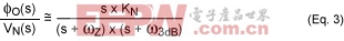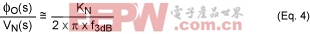 式3显示,当电源干扰(PSI)频率大于PLL的3dB带宽时,PLL时钟发生器的电源噪声以20dB/十倍频程衰减。对于介于ωZ和ω3dB之间的PSI频率,输出时钟相位随PSI的幅度变化关系式如下: