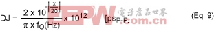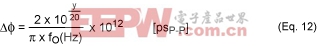 观察功率频谱分析仪,可以看到窄带相位调制出现在载波附近的两个边带。图6给出在这种情况下采用Agilent? E5052频谱监视器观察到的结果。测量的第一个边带幅度与载波幅度之比为-53.1dBc,按照式9,转换为11.2psP-P的DJ。
