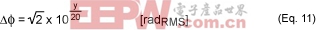 测量功率频谱SV(f)时,有一种办法可以避免幅度调制的影响。在电源上叠加一个单一频率的正弦干扰信号,可以通过测量相位噪声频谱的杂散信号替代DJ的计算。以变量y (dBc)表示频偏fM处测量的单边带相位杂散功率,可以得到相位偏差ΔΦ(radRMS)为: