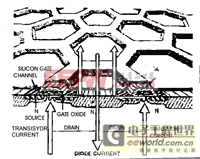 图中已标明了漏(Drain)和源(Source)。漏源之间的电流通过一个沟道(Channel)上的栅(Gate)来控制。按MOSFET的原意,MOS代表金属(Metal)-氧化物(Oxide)-半导体(Semiconductor),即以金属层(M)的栅极隔着氧化层(O)利用电场的效应来控制半导体(S)。FET(FieldEffectTransistor场效应晶体管)的名字也由此而来。然而我们从图1中可以看到,HEXFET中的栅极并不是金属做的,而是用多晶硅(Poly)来做栅极,这也就是图中所注明的硅栅极(SiliconGate)。IR在1978年时是用金属做栅极的,1979年的Gen-1HEXFET是世界上第一个采用多晶硅栅极的多原胞型功率MOSFET。
