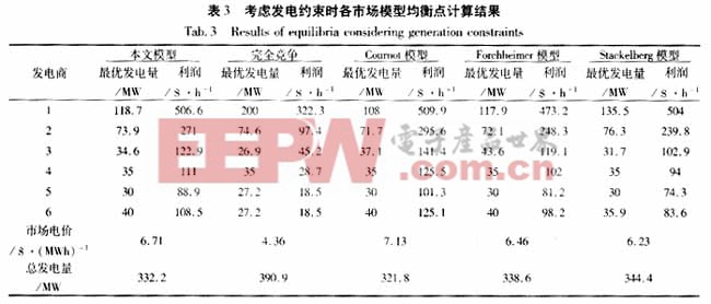 从表中结果可以看出,当不考虑发电约束时,由于本文模型的价格接受者少于Forchheimer模型而多于Stackelberg模型,因而计算得到的市场电价高于完全竞争的模型和Forchheimer模型而低于Stackelberg模型和Cournot模型。当考虑发电约束时,由于本文模型作为价格接受者的发电商6超越上限,因而使得剩下的参与竞争的发电商数目少于Stackelberg模型参与竞争的发电商数目,因而此时采用本文模型计算得到的市场电价高于Stackelberg模型计算的电价。