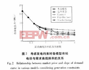 为分析需求弹性对发电商均衡策略的影响,本文考虑了逆需求曲线斜率s放大0.2~2倍的情况,此时不考虑发电约束时五种模型的均衡电价计算结果见图1,考虑发电约束时均衡电价计算结果见图2。