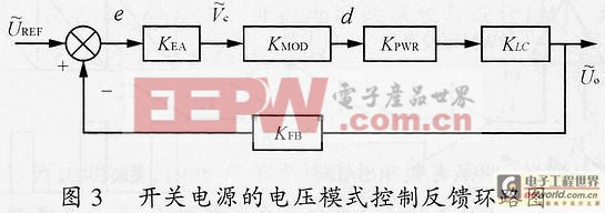 式(16)为式(15)的小信号波动方程。整个电路的环路结构如图3所示。图3没有考虑输入电压的变化,即假设Uin=0。图3中,(一般为0)及分别为电压给定与电压输出的小信号波动;KFB=UREF/Uo,为反馈系数;误差e为输出采样值偏离稳态点的波动值,经电压误差放大器KEA放大后,得;KMOD为脉冲宽度调制器增益,KMOD=d/=1/Vs;KPWR为主电路增益,KPWR=/d=Uin;KLC为输出滤波器传递函数,KLC=(1+sCRe)/[S2LC+s(ReC+L/Ro)+1]。