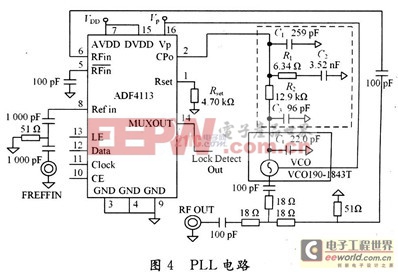 ADF4113是ADI公司研制的数字锁相频率合成器,最高工作频率可达4 GHz,可用于无线射频通信系统的基站、手机、通信检测设备及CATV设备中。该芯片内部主要包括可编程的14位基准分频器;可编程双模式前置分频器:8/9,16/17,32/33和64/65;可编程的射频信号分频器;3线串行总线接口;模拟和数字锁定状态检测功能。该芯片具有良好的相位噪声参数,鉴相频率为200 kHz时,相噪基底为-164 dBc/Hz;输出1 840 MHz时,相噪可达-85 dBc/Hz。VCO选