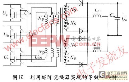 三个单相PFC经逆变后的交变电压相位、频率、幅值相同,通过三相矩阵高频变压器的耦合、变压及隔离,输出所需要的直流电压。三个单相PFC独立性比较强,输出之间相互电气隔离,解决了三个单相PFC之间相互影响的图12利用矩阵变换器实现的等效电路图这一技术难题。
