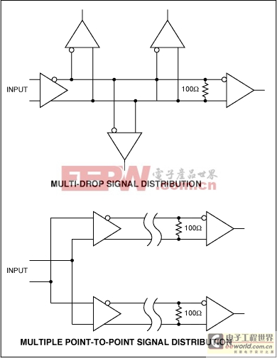 多点至单点分配结构中需要多路驱动器,可定义为点到点的操作,相当于驱动器与一路本地终端接收机之间通信。这种结构减少了信号完整性问题,能够保证传输媒介的阻抗尽可能一致,消除了多条支路产生的干扰。