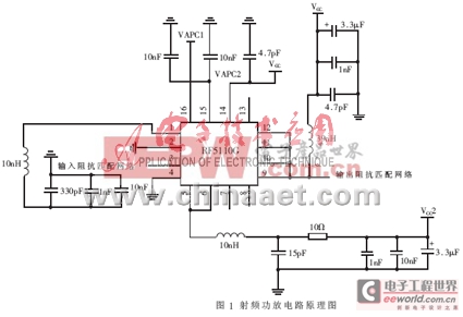 射频功率放大电路的原理图如图1所示,工作频率为433MHz,以功放集成芯片RF5110G为主芯片,RF5110G集成了三级放大器。图1中,与VCC1(1)、VCC(14)和RF OUT(9、10、11、12)连接的电容、电感主要对电源进行滤波。第一级和第二级放大器的关断由与VAPC1(16)连接的电容控制,第三级放大器的关断由与VAPC(15)连接的电容控制。输入和输出阻抗匹配网络是需要设计的部分。如何确定阻抗匹配网络中的微带传输线和元件的类型、参数以及连接关系,是射频功放阻抗匹配优化设计的关键。