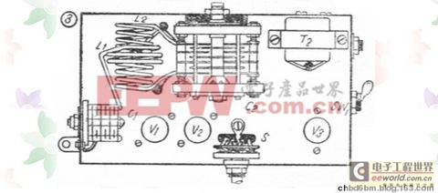 天线电容器C1装在一块厚3~5公厘的胶木板上,胶木板固定在底板的侧面。胶木板的上下各装一只厚约1公厘带孔的弯角硬铜片,天线杆就从上面的弯角铜片孔中穿入用螺丝固定在下面弯角铜片上,下面的铜片也当作天线的接线和C1相联(图2丙)。