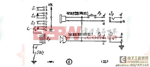 这里把收发用的4刀双掷开关取消。改用6V/30mA带有4副接点的直流继电器RY代替,SW2是继电器的电源开关,可以放在送话器的手柄上,只要用握送受话器的手指按下SW,机器就从收话转换成发话。方便不少。平时SW2是断路的,各接点的接线和通断如图6甲所示。当SW2按下时,继电器接通电源,S1的C、B点闭合,S2的C和A断开和B闭合,S3的C、B闭合,S4的C、A断开。作用和用手动的收发转换开关一样。由于在送受话器上增加了一只SW2,就多出了一根接线,所以塞子P1和塞孔J1也要改用两只二芯塞子P2、P3和塞孔J2、J3。接线见图6乙。但安装时要注意塞孔J2要和底板绝缘。