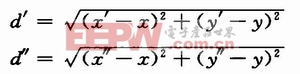 出的算法得到位置(x",y")。比较两个位置的误差大小d'与d",如图6所示。