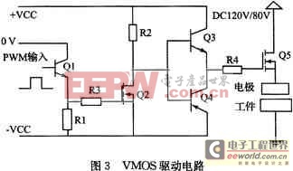 Q1的基极是从FPGA开发板经过光耦输出的PWM脉冲信号,通过后面的驱动电路来驱动Q5,从而实现放电加工电路中采用正负电源,这样可以提高Q5的关断速度。Q2是小功率的VMOS管,Q3和Q是用来驱动大功率的VMOS,所以功率不能选太小,R3与R4是用来减小系统波形的振荡,其阻值不能太大,可选取100 Ω。