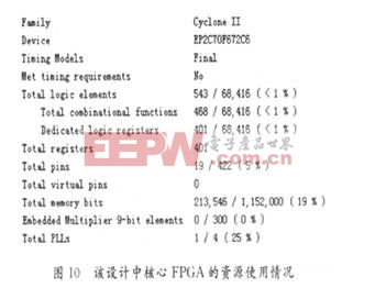 数器的时钟输入端;第二级计数器的作用是,产生地址信号以驱动频率控制字存储器输出相应的控制字,当前级进位信号有效时该计数器输出加“1”。以达到改变频率输出的目的,其连接电路图如图9所示。 4 仿真与验证 将该设计通过将程序下载到Altera公司生产的DSP开发板(型号DK-DSP-2C70N)中进行仿真,其核心FPGA(型号为EP2C70F672C6)的资源使用情况如图10所示。 并通过该开发板上D/A转换器输出模拟波形(只截取了4个时刻的图样)如图11所示。 通过图11可以看出该设计能很好地完成扫频输出的功能,并且杂波分量很小,干扰很小。 5 结 语 该设计通过采用技术成熟的NCO IP Core完成,其优势在于: (1)利用了成熟的FPGA知识产权技术,使得设计更加简便并易于移植;