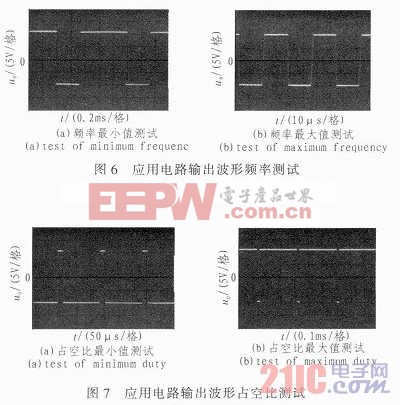 由图6、图7测得矩形波发生器应用电路的输出波形参数如下:频率调节范围为1.72~23.8 kHz,作为方波信号源时频率调节范围为2.6~23.8 kHz;占空比调节范围为11.4%~94%;电压幅值调节范围为0~10.5 V;电路的输出阻抗为224 Ω。未接入幅值调节电路时的输出阻抗为l 042 Ω。所测参数与Multisim 10仿真分析结果基本接近。