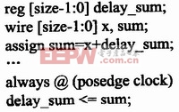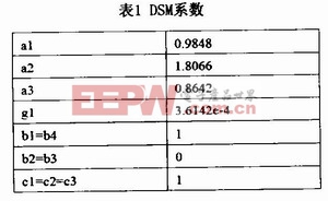 的幅度;第三级积分器输出通过g反馈给第二级积分器,即局部反馈(LFB),这在NTF中引入了共轭零点,挺高了基带SNR。根据高阶稳定的调制器函数的设计方法,设计一个过采样率为128和3位量化器的3阶调制器,图2中的系数值(a1、a2、a3、a4、bl、b2、b3、b4、cl、c2、c3、g1),由Richard Schreier提供的Matlab Delta-sigma调制器设计工具包可以得出,具体值在表1中给出,表中的数值用于设计NTF和STF的Matlab模型。在实际的数字电路实现时,为了减少芯片面积和设计难度避免使用乘法器,所以这些系数均取2n的近似值,这样可以用移位相加来代替乘法。利用Richard Schreier提供的Matlab Delta-sigma调制器设计工具包得到带外增益为6.1,DSM的NTF为 2.3 Verilog语言行为级建模 本文使用Verilog硬件语言来实现单回路差异积分调制器,由时钟控制构成延迟积分器与非延迟积分器的相加动作。assign指令使等式两边永远处于活动状态,而alwavs指令将会在时钟正好触发时将sum的值存入寄存器delay_sum中,因此,所有的积分器将会在每一次时钟完成时完成一次累加动作。同理,非延迟积分器是由相同的程序代码组成。实现延迟积分器的程序部分代码如下表示: