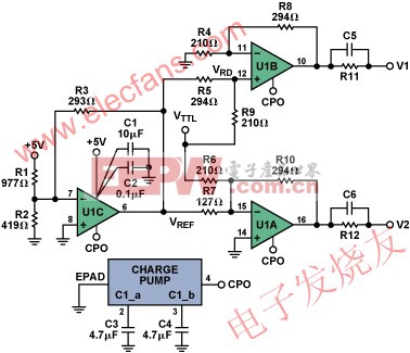 图7. AD8037 PIN二极管驱动器电路 本例中,U2和U3采用同相配置,增益为4。利用AD8037的独特输入箝位特性,可以实现极其干净和精确的箝位。它可以线性放大输入信号,最高可达增益乘以正负箝位电压(VCH和VCL)。当增益为4且箝位电压为±0.75 V时,如果输入电压小于±0.75 V,则输出电压等于输入电压的4倍;如果输入电压大于±0.75 V,则输出电压箝位在最大值±3 V。这一箝位特性使得过驱恢复非常快(典型值小于2 ns)。箝位电压(VCH和VCL)由分压器R2、R3、R7和R8确定。 数字接口由74F86 XOR逻辑门(U1)实现,它提供U2和U3所用的驱动信号,两路互补输出之间的传播延迟偏斜极小。电阻网络R4、R5、R6和R9将TTL输出电平转换为大约±1.2 V,然后通过R10和R12馈送给U2和U3。 U2和U3的±1.2-V输入提供60%过驱,以确保输出会进入箝位状态(4 × 0.75 V)。因此,硅PIN二极管驱动器的输出电平设为±3 V。电阻R16和R17限制稳态电流。电容C12和C13设置PIN二极管的尖峰电流。 AD8137—差分放大器 差分放大器(本例所用的AD8137)可以低成本提供出色的高速开关性能,并使设计人员能够十分灵活地驱动各种类型的RF负载。有各种各样的差分放大器可供使用,包括速度更快、性能更高的一些器件。 高速差分放大器AD8137通常用于驱动ADC,但也可以用作低成本、低功耗PIN二极管驱动器。其典型开关时间为7 ns至11 ns,其中包括驱动器和RF负载的传播延迟。它提供互补输出,功能多样,可以替代昂贵的传统驱动器。 图8所示电路将单端TTL输入(0 V至3.5 V)转换为互补±3.5V信号,同时可使传播延迟最小。TTL信号放大4倍,在AD8137输出端产生所需的±3.5V摆幅。TTL信号的中点(或共模电压)为1.75 V;必须将同样的电压施加于R2,作为参考电压VREF,以免在放大器输出端引入共模失调误差。最好从一个低源阻抗驱动此点;任何串联阻抗都会增加到R1上,从而影响放大器增益。 图8. PIN二极管驱动器原理图 输出电压增益可由公式4计算: (4) 为正确端接脉冲发生器的输入阻抗,使之为50 ,需要确定差分放大器电路的输入阻抗。这可以利用公式5计算,得出RT = 51.55 ,与之最接近的标准1%电阻值为51.1 。对于对称的输出摆幅,两个输入网络的阻抗必须相同。这意味着,反相输入阻抗必须将信号源的Thévenin阻抗和端接电阻纳入增益设置电阻R2。有关详情,请参阅应用笔记AN-1026。 (5) 图8中,R2约比R1大20 ,以补偿源电阻RS与端接电阻RT的并联组合所引入的额外电阻(25 )。将R4设为1.02 k(最接近1.025 k的标准电阻值),以确保两个电阻比相等,避免引入共模误差。 输出电平转换很容易利用AD8137的VOCM引脚来实现,该引脚设置直流输出共模电平。本例中,VOCM引脚接地,以提供关于地的对称输出摆幅。 电阻R5和R6设置稳态PIN二极管电流,如公式6所示。 (6) 电容C5和C6设置尖峰电流,该电流有助于注入和移除PIN二极管中存储的电荷。可以根据特定二极管负载要求,调整这些电容的值,实现性能优化。尖峰电流可以由公式7计算。 (7) ADA4858-3—内置电荷泵的三通道运算放大器 许多应用只提供一个电源,这常常令电路设计人员感到为难,尤其是当需要在PIN电路中提供低关断电容时。这种情况下,硅或GaAs PIN二极管驱动电路可以使用片上集成电荷泵的运算放大器,而不需要外部负电源;其好处是可以显著节省空间、功耗和预算。 高速电流反馈型三通道放大器ADA4858-3就是这样一种器件,它具有出色的特性,片上集成电荷泵,输出摆幅可以达到地电压以下–3 V至–1.8 V(具体取决于电源电压和负载)。该器件十分鲁棒,可以真正为其它电路提供最高50 mA的负电源电流。 ADA4858-3为单电源系统中的互补PIN二极管微波开关驱动问题提供了一种独特的解决方案。回顾图4,从中可以看出:即使很少量的反向偏置也有助于降低二极管电容CT,具体取决于PIN二极管的类型。此类驱动器对GaAs PIN二极管很有利,因为这种二极管通常不需要很大的负偏置就能使关断电容(CT)保持较小的值(图9)。 图9. GaAs CT电容与电压的关系 图10所示电路用ADA4858-3作为PIN二极管驱动器。可以在输入端增加一个缓冲门,使该电路兼容TTL或其它逻辑。对此电路的要求是将TTL 0V至3.5V输入信号摆幅转换为互补–1.5V至+3.5V摆幅,用于驱动PIN二极管。 图10. ADA4858-3用作PIN二极管驱动器 R1、R2、R3和U1C形成该电路的–1.5V基准电压,内部负电压CPO由片内电荷泵产生。电容C3和C4是电荷泵工作所必用一对AD8037(U2和U3)驱动PIN二极管。