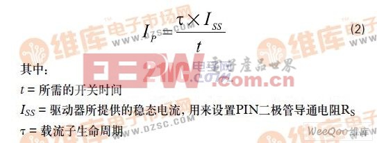 要导通或截止二极管,必须注入或移除所存储的电荷。驱动器的工作就是以极快的速度注入或移除所存储的电荷。如果开关时间小于二极管的载流子生命周期,则可以利用公式2近似计算实现快速开关所需的峰值电流(IP)。