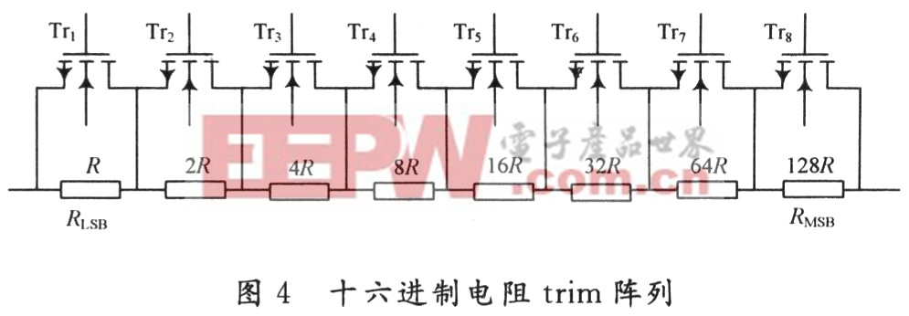 在微调电阻阵列的设计中,要充分考虑晶体管的工艺偏差和开关的传输延迟,减小开关晶体管的导通电阻对trim电阻的影响。