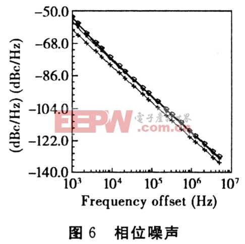 主要参数设置:电感采用库内的高品质八角形对称电感,电感值L1为3.2 nH,指数为12;电容采用的是PMOS变容二极管,最小电容为O.25 PF,最大电容为O.6 PF,变化范围为O.35 PF;通过tran、pss、pnoise仿真得出主要性能指标,如图4、5、6所示,所设计振荡器在控制电压O~1.8V下振荡频率为4.0l GHz~5.46 GHz,有良好的频谱纯度,变化范围为31%,覆盖了所要求的802.11a的两个频段5.15 GHz~5.35 GHz,输出振幅峰一峰值830 mV,相噪声为l MHz频率偏移下为一121dBc/Hz。本文设计的振荡器已经达到802.11a标准要求。