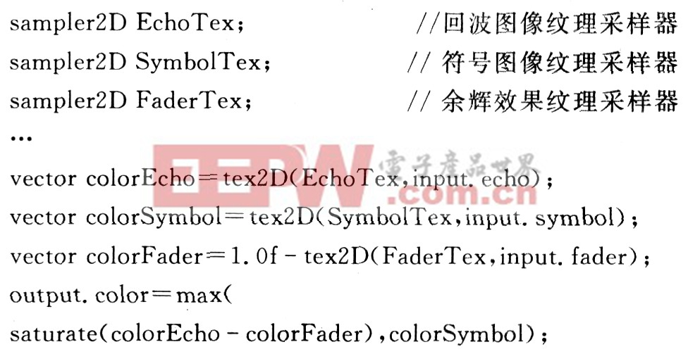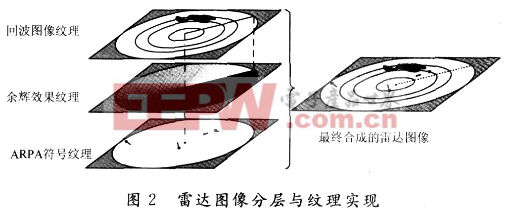 GPU负责纹理的合成。渲染雷达显示器时,这3层纹理在像素着色器中进行混合,产生最终的雷达图像。混合代码如下: 3 雷达回波图像更新与直接像素存取 4 余辉效果与渲染到纹理 要形成随时间变化的动态效果,模拟程序需要在帧间隔内根据顶点坐标和当前扫描线的位置,重新设置每个顶点的颜色。Direct3D重新渲染便产生了亮度渐变且动态变化的圆。 5 ARPA符号绘制与GDI绘图 6 结 语