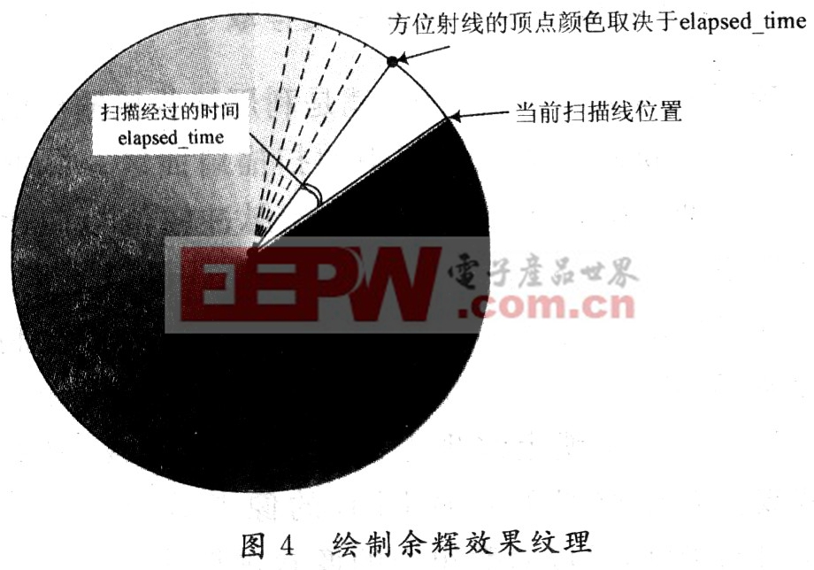 为了绘制出图4中的余辉效果纹理,可用N条射线来组成余辉效果纹理中的圆,N等于天线方位刻线的数量,每条射线的颜色由其端点颜色决定。N条射线需要用2N个顶点来描述,顶点除含有坐标外,还包括颜色值。创建了这些顶点后,Direct3D在渲染管线中自动将其绘制成图像。