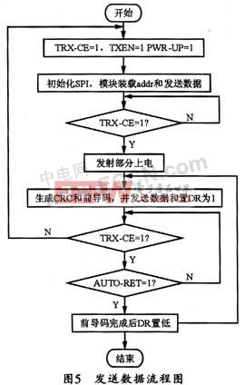 .5无线收发电路设计 本系统的无线发射接收电路主要利用nRF905与外围器件构成的电路组成,其主要部分是天线。简而言之,就是一个特定形状的导体,它可以将电流转化为射频能量并以电波形式发射出去.或将无线电波接收进来。任何一个无线系统都有天线,天线设计的好坏直接影响无线系统的收发能力。图4所示是用nRF905差分连接的环形天线图。 2系统软件设计 本系统中的无线数据传输主要由无线数据收发器nRF905、ATMEGA 16单片机和显示部分组成。nRF905收发器与单片机ATMEGA16L间通过SPI口进行通信。因此,软件设计过程中的重点是nRF905数据的发送和接收过程。 2.1 nRF905的数据发送过程 发送数据时的工作流程如图5所示。当MCU有遥控数据节点时,接收点的地址(TX-address)和有效数据(Tx-payload)将通过SPI接口传送给nRF905。设计时应使用协议或MCU来设置接口速度。 可用MCU设置TRX-CE,并使TX-EN为高电平来激活nRF905的ShockBurst传输。通过nRF905的ShockBurst可使无线系统自动上电,并完成数据包(应加前导码和CRC校验码)的数据码发送(100 kbps,GFSK,曼切斯特编码)。 如果AUTO-RETRAN被设置为高电平,那么,nRF905将连续地发送数据包,直到TRX-CE被设置为低电平为止;而当TRX-CE被设置为低电平时,nRF905则结束数据传输,并将自己设置为standby模式。 2.2 nRF905的数据接收过程 当系统接收数据时,其接收数据流程图如图6所示。系统的工作过程如下: 首先,在650μs以后,nRF905将不断监测空中的信息;当nRF905发现有和接收频率相同的载波时,其载波检测(CD)被置为高电平;此后,当nRF905接收到有效地址时,地址匹配(AM)被置为高电平; 在这之后,当nRF905接收到有效的地址包(CRC校验正确)时,nRF905将去掉前导码、地址和CRC位,同时将数据准备就绪位(DR)置为高电平,并用MCU设置TRX-CN为低电平,以进入standby模式,从而使MCU能够以合适的速率通过SPI接口读出有效的数据;当所有的数据读出后,nRF905将AM和DR设置为低电平,以便使nRF905准备进入ShockBurst RX、ShockBurst TX或Powerdown模式。 3 结束语 无线射频收发芯片nRF905内置有天线,同时内部集成有调制,解调、编码/解码等功能,故在通信过程中能自动生成前导码和CRC校验,而不需要接人网络就能享受通信服务。本设计根据nRF905的特点设计的无线数据收发系统,经过多次实验证明,其发射端能正确地将数据传送出去;同时,经nRF905发射后,接收端也能正确接收并显示数据,有效通信距离大于200米。在有障碍物体的混凝土结构的建筑内测试,其有效直线通信距离大于50 m。此外,该系统采用了比较完善的软件、硬件设计以及抗干扰措施,这样,就可以保证系统工作的安全性和可靠性,并具有通用性,便于投入实际应用,而且稍作改动就可以应用到小区传呼、工业数据采集、生物信号采集,无线遥控等其它一些短距离无线通信领域,以实现无线数据的双向传输,具有较好的市场应用价值。