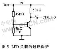 连接一只与LED负载串联的外部感应电阻RSENSE,可对每通道的LED电流编程设置,同时用CTRL输入设置感应电阻的电压调节门限。若CTRL电压VCTRL小于1 V,LED电流ILED=VCTRL/(10 RSENSE),如果VCTRL大于1 V,LED电流ILED=100 mV/RSENSE CTRL还可与PTC电热调节器相结合,提供LED负载的过热保护,如图5所示。
