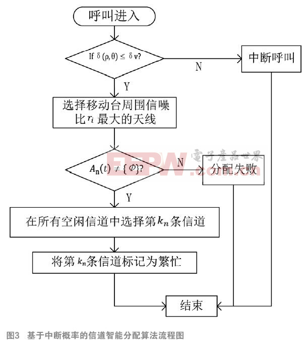 基于中断概率的信道智能分配算法(Channel Intelligent Allocation Algorithm based on Outage Probability,CIAAOP)首先需判断移动台能否正常通信,即根据移动台的中断概率公式计算出移动台的中断概率,将其与设定门限值比较,若不大于门限值则表示该移动台可以被分配信道;接下来只需在所有天线(天线总数量用Ntotal表示)中选择移动台周围信噪比最大的天线,运用动态信道分配算法分配合适信道。基于中断概率的信道智能分配算法流程图如图3所示。 该算法会定期检测每个分布天线中所有可选信道的平均干扰量,并将平均共信道干扰量(Co-Channel Interference, CCI)存储在每个天线相对的共信道干扰表中,当有信道请求时,所有空闲信道中共信道干扰量最低的信道将会被分配。在分布式天线系统中运用动态信道分配算法,使得在一个蜂窝小区内同一条信道能够重复利用,相对于传统的蜂窝系统,该算法能显著提高频谱的利用效率。