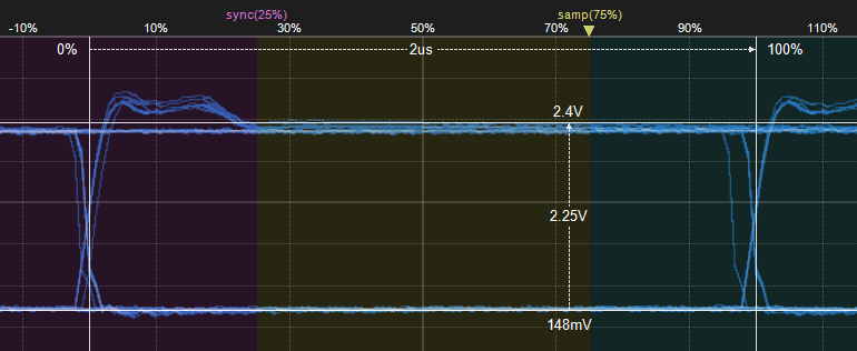 由此可见,该方法虽然可以大致测量出CAN节点的差分电平位信号特征,但由于其用于做分析的样本很少,测量方式有很难操作,所以为了提高测量结果的准确度,减低人工成本,广州致远电子股份有限公司改进了测试方法,使用CANScope-Pro总线分析仪、CANScope-StressZ扩展板,使用配套软件的样眼图与对称性测试进行测量。
