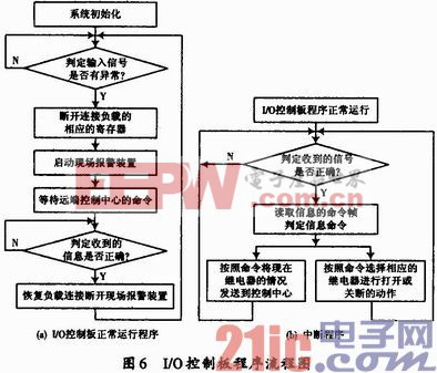 根据I/O控制板的设计目的,I/O控制板要实时监控输入信号,当发生异常时,要主动切断与继电器相连的负载,以保证整个系统的安全。同时,还可以接收监测远端控制中心通过无线射频模块发送的控制信息,控制现场继电器的通断和将自己现在的状况回馈给监控中心。按照设计要求,控制板的程序流程图如图6所示。