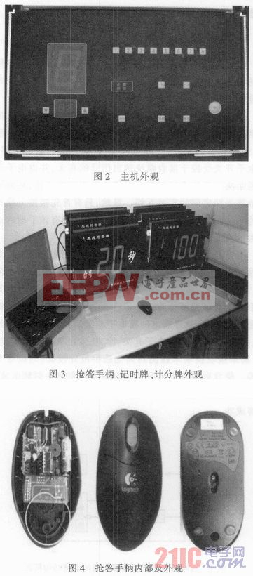 图2是主机外观图片,图3是抢答手柄、记分牌、计时牌的外观图片,图4是抢答手柄的内部及外观图片。