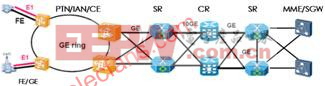 (3)核心/汇聚层采用路由器,接入层采用IAN。IAN即综合接入节点设备,是中国电信新定义的一种结合了MPLS-TP和IP/MPLS功能的数据设备。这种方式比较适合拥有丰富IP城域骨干网资源的运营商,在实现LTE业务承载的基础上,还可实现对大客户专线及组播等高品质精品业务的综合承载。