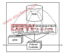 路由信息数据库(RDB):RDB存储本地拓扑,网络拓扑,可达性和其它通过路由信息交换获得的信息,以及配置信息。RDB可以包含多个路由域的路由信息。RC可以接入RDB的一个视图(关系数据库的专用名词。视图是一个虚表,它自己没有存储空间,而是从实际存放在数据库中的表中导出的。视图用法与物理表相同,并可使不同用户看到同样数据的不同格式,以及利用授权模式控制用户对敏感数据的存取)。图2 的虚线框表示了这种关系。RDB是协议无关的。由于RDB可以包含多个路由域的路由信息(即可能是多层网络),因此接入RDB的RC可能共享路由信息。如图3 所示。
