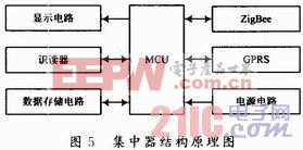 集中器以单片机为核心,由电源电路、识读器、GPRS模块、ZigBee模块、数据存储电路和显示电路等部分组成,其硬件框图如图5所示。该硬件的主要功能是通过识读器读取射频卡数据,存储购热量并将卡内数据清零;同时定时通过ZigBee网络获取采集器渎取的热量表数据和锁闭阀状态,并将数据存储打包;最后通过GPRS网络向中心服务器传送数据包。