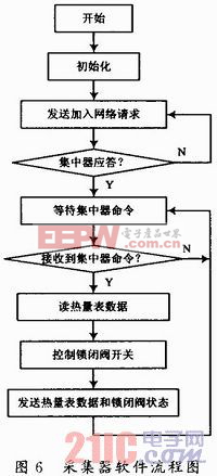 采集器的软件流程图如图6所示。该软件的工作过程首先是对ZigBee模块进行初始化,包括初始化串口、I/O口等;然后发送加入网络信号,等待集中器内的ZigBee模块的应答。若没有接收到应答,采集器则继续发送入网信号,若加入网络成功,则等待集中器的命令。接收到集中器的命令后,即可通过接口电路读取热量表的数据,并通过控制电路开关锁闭阀。