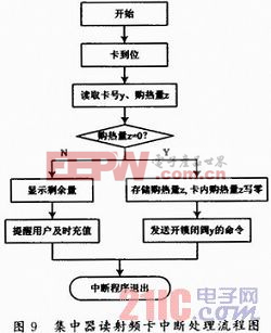 集中器的软件流程如图7所示。其中系统初始化包括定义系统的时钟信号、工作频率、存储器初始化及I/O接口、定时器等外设的初始化,其初始化流程图如图8所示。初始化ZigBee模块就是建立网络,同时与采集器建立连接;初始化GPRS模块申请入网则与中心服务器建立连接。当有射频卡进入识读器的工作场时,程序会进入中断函数,完成射频卡的读写操作,图9所示是集中器读射频卡中断处理流程图。如果定时器时间到了,程序进入定时器中断函数,并采集热量表的标志位置位,同时在主程序中开始通过ZigBee网络向采集器发送数据请求,然后等待返回数据,最后将接收的数据打包通过GPRS网络上传至中心服务器。