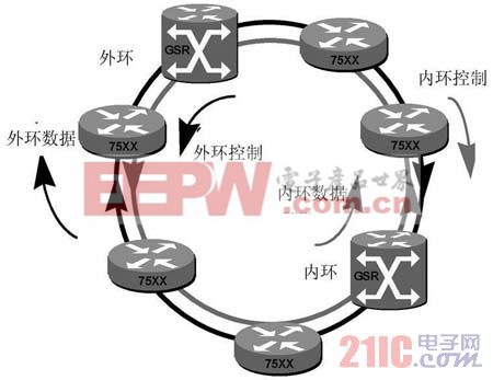 为了区分两个环, 不妨将一个叫内环, 另一个叫外环。SRP 运行时, 在一个方向发送数据( 下行流) , 而在反方向的另一根光纤上传输控制信号( 上行流) 。两根光纤互为控制, 因此共有两个上行流和两个下行流。这样, SRP 便能最大限度地利用光纤的传输带宽。同时,由于控制信号不受数据流干扰( 例如排队、突发拥塞等) , 能够快速传输, 从而为带宽的进一步优化和网络的高速自愈提供了保障。