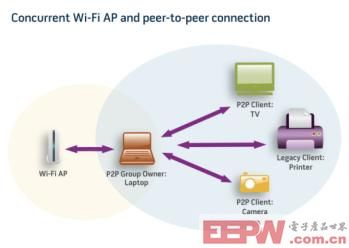 与企业原有的无线网络相连时,一个WLAN接入点可以实施管理Wi-Fi Direct设备的功能,为企业基础设施网络提供稳定的保护与隔离。这是P2P连网在企业环境中十分必要的一环。具有这种功能的WLAN接入点可以因任何Wi-Fi Direct设备违反政策的行为而解除其基础设施网络验证,并通报解除验证的原因。在Wi-Fi Direct与WLAN共存的情况下,两者是处于相互补充的关系,被管理的Wi-Fi Direct设备可以帮助WLAN接入点收集P2P共存信息,WLAN接入点则可以通报P2P小组的信道或能源限制。一旦Wi-Fi Direct设备出现违反政策的行为,WLAN接入点可以解除其认证,并将解除认证的原因通知该设备。Wi-Fi Direct设备在进行关联以实施此类监控时,需要将其身份报告给WLAN接入点。可以选择在WLAN接入点和Wi-Fi Direct设备实施被管理的设备功能,WLAN接入点则可选择只验证被管理的设备(即支持可选管理机制的设备)。