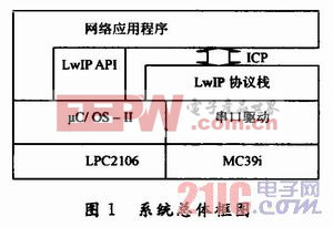 磁条卡信息终端基于ARM单片机和μC/OS-Ⅱ实时操作系统。μC/OS-Ⅱ是由Jean J.Labrosse编写的一种公开源代码的实时操作系统。但是μC/OS-Ⅱ只提供了一个操作系统内核,没有提供网络协议栈、文件系统等支持。在μC/OS-II操作系统上移植开源的嵌入式TCP/IP协议栈LwIP,利用西门子公司的GPRS模块MC39i就可以实现无线Internet的接入。系统总体框图如图1所示。