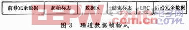 磁道上的数据帧包括前导冗余数据、起始标志、数据区、结束标志、纵向冗余校验位(LRC),后沿冗余数据6个部分(见图3),冗余数据区不含有效数据,只用作磁道数据的同步,由若干的0组成。起始标志为11010;结束标志为11111;LRC为磁道上有效字符的异或和。正向刷卡时,数据将按图3的数据帧格式输出;反向刷卡时,数据帧将会被前后反转输出,即先检测到LRC,再检测到结束标志、数据区、起始标志,同时每个字符的位顺序也是前后反转输出的。此外,BS100E解码芯片输出的数据采用负逻辑表示,即输出为1的数据,实际上表示的是数据0,必须取反后才能使用。