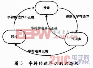 在译码数据时,为了提高实时性,所有的数据处理都在中断中进行。在每次RCPA上升沿触发中断时读取RDPA的数据并处理。在解码时,首先要确定字符的边界,即确定一个字符的起始位。字符的边界识别采用图5所示的状态机实现。