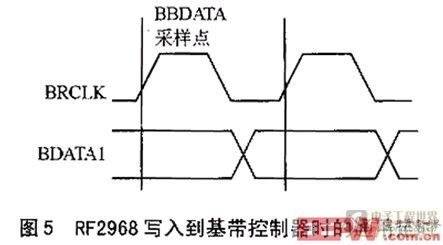 “写”周期,基带控制器在BDCLK下降沿驱动数据包的每一位,RF2968在数据寄存器设为高状态后,在BDCLK第1个下降沿到来时被移位寄存器的内容更新,如图3所示。