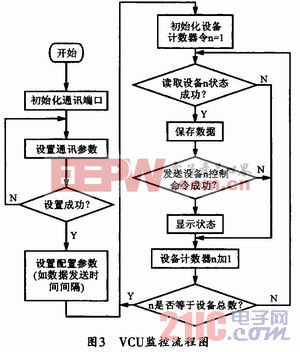 本设计在CANopen通信网络的基础上,以牵引系统为例来设计牵引系统与控制单元之间的通信网络接口,然后由列车主控制器VCU完成监测过程中数据的处理和虚拟仪器的工作。图3所示是由VCU完成监测控制的程序流程图。