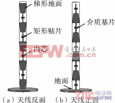 在移动通信领域中,全向高增益天线有着广泛的应用。微带交叉阵子天线作为一种全向高增益天线,以其结构简单,匹配容易,便于批量生产以及造价低廉等优点受到重视。一般的微带交叉阵子天线如图1所示,这种结构在仿真和实测中,方向图畸变比较严重,天线的电压驻波比也比较差。文献给出了一种改进的方案,将微带天线的地面做成梯形结构,如图2所示。这在一定程度上改善了天线性能。文中给出了该结构天线的仿真和实物测试结果,以便与本文提出的微带全向天线作比较。文中所提出的微带全向天线如图3所示。该天线除了采用微带渐变结构和电感匹配器外,还在天线的顶端加载了λg/4短路匹配枝节。仿真和测试表明,该天线同文献中提出的天线相比较,具有更好的电压驻波比和更高的增益,是一种高性能的微带全向天线。