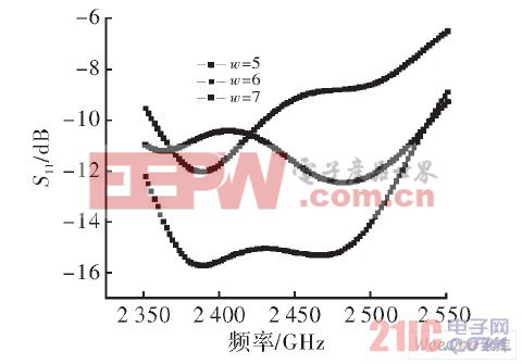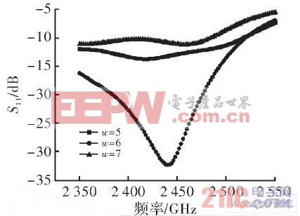 图5给出了不同值时天线的S11。经过优化,当w=6时,此时的天线具有最佳的匹配性能。这时天线S11在带内-15 dB。