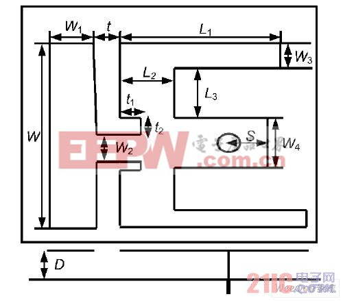从图1 可以看出,天线的基本结构由E 形微带贴片和微带偶极子组成。E 形微带贴片的两个端臂等长,中间为同轴馈电端口。电波通过馈电端口均匀地分布在E 形微带贴片和偶极子上,使得贴片产生两个谐振频率。耦合缝隙t、宽度W2、W1 和W 决定偶极子的辐射,产生低频段的谐振频率。E 形微带天线产生天线的高频段的谐振频率,偶极子微带天线谐振在低频段,2 个辐射源共用一个同轴馈电。