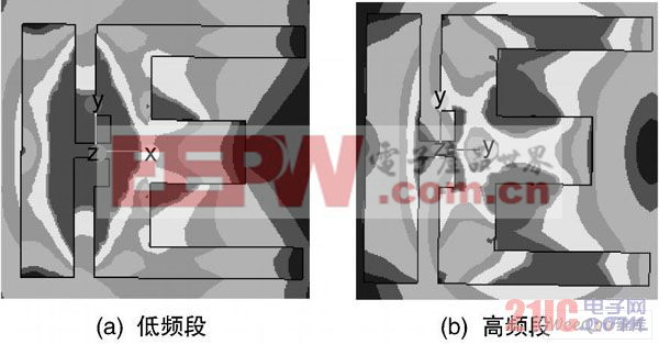 图2 给出了所设计天线的电流分布。从图2( a)可以看出,电波通过嵌入E 形微带贴片的连接传输线引导和缝隙t 的耦合作用,在偶极子上产生了很强的辐射,使得微带偶极子的带宽增加,从而满足IEEE 802. 11b/ g 的通信需求。从图2( b) 可以看出,电流均匀地分布在E 形微带贴片的两臂上,增加了电流的分布长度,使得E 性天线有很大的带宽,可以满足5. 1~ 5. 825 GHz 无线通信的需求。