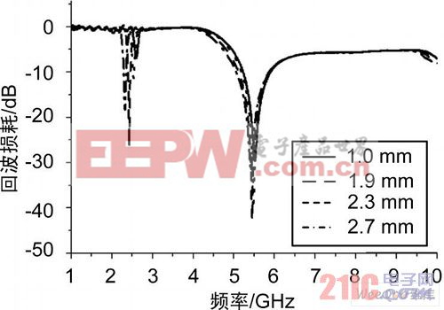天线的基本结构如图1 所示,整个天线制作在40 ×40 mm2 的泡沫塑料( 介电常数是1. 07,与空气的介电常数接近) 板上,介质板的高度为5 mm,E 形微带贴片和微带偶极子贴片的厚度均采用0. 2 mm的铜皮,接地板采用0. 2 mm 的铜皮,以确保天线有足够的支撑强度。