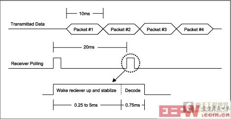 除了译码时间外,轮询操作必须首先具备接收器"唤醒"和稳定时间。大多数放大电路可以快速唤醒,但VCO晶体是机电元件,它需要一定的起振时间,当然,它还需要更长的时间才能稳定在所要求的频率。对于传统的超外差接收机,该时间通常需要2ms至5ms。而MAX1470的VCO从上电到晶体稳定振荡只需0.25ms。于是,在每20ms内,通过唤醒检测发射信号只需要1ms (0.75ms解码、0.25ms稳定) (图2)。可快速唤醒的MAX1470工作电压为3.3V,而不是5V,这是节省能量并延长电池寿命的四个或五个因素中的一个(相对于传统的超外差接收机)。
